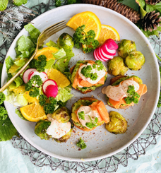 So einfach kann es sein, sich mit pflanzlichen Zutaten gesund und schmackhaft zu ernähren: Süßkartoffel-Taler Vorspeisenteller.