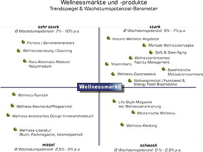 Die Chancen-Risiken-Trend-Matrix (SWOT) dokumentiert eine Stärken-Schwächen-Analyse der aktuellen Trends im Wellnessmarkt. Die Hauptursache für den deutlichsten Negativtrend ist das Ergebnis eines jahrelangen Booms des Wellnessmarktes: Mit der starken Massenausbreitung des Wellnessbegriffs und der damit einhergehenden Massenintegration von Wellnesseigenschaften in Alltagsprodukte begann gleichzeitig die Standardisierung, Absorption und Entwertung bisher eigenständiger Wellnesswirkungen und ihres Privilegs. Der Wellnesseffekt avancierte auf diese Weise zum herkömmlichen Standardbegriff und verlor damit seine Exklusivität und Eigenständigkeit als Markenprofil. Die fehlende Mehrwert-Differenzierung der Wellnesspositionierung führt zu einem wachsenden Identitätsverlust von Wellnessleistungen, der für eine Abschwächung des Umsatzpotenzials von Wellnessoutputs verantwortlich ist. Beispiel Hotellerie: In den 1990er Jahren sorgten Wellnessleistungen als Service-Mehrwert für steigende Umsätze, mittlerweile sind Wellnesseinrichtungen Standard, bieten kein Unterscheidungsmerkmal mehr und locken weniger Besucher. Oder die Wunderpflanze „Aloe Vera“, die ebenfalls ihren psychologischen Vermarktungszenit überschritten zu haben scheint, obwohl das reale Potenzial beider Beispiele nach wie vor erheblich ist.